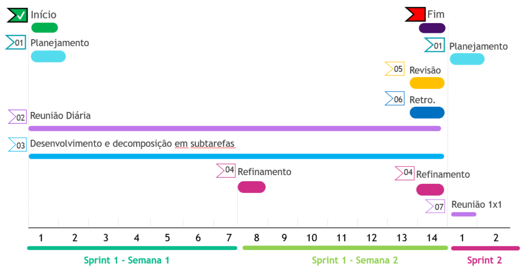 Outros eventos podem ser acoplados, como Reunião de Refinamento e Reunião 1×1. Abaixo apresento sugestão de ciclo de vida de uma Sprint de 2 semanas:
