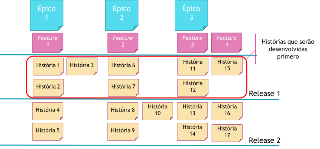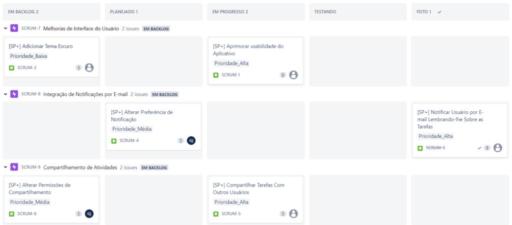 Também é possível criar raias com nome de cada desenvolvedor, por status, etc. O exemplo a seguir está por Épicos: