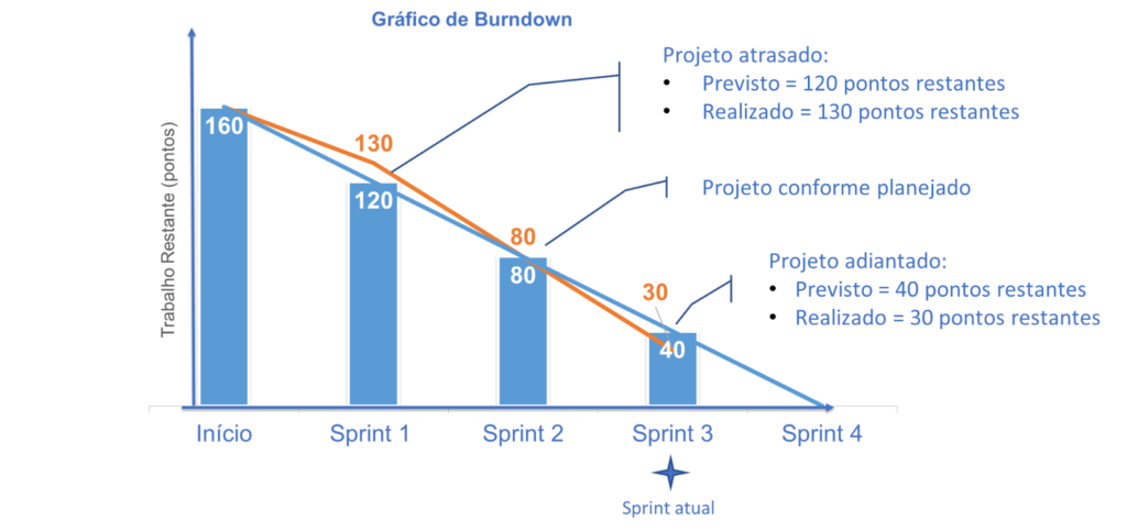 O trabalho pode ser medido por pontos de complexidade que faltam para concluir o trabalho. A vantagem do gráfico é a simplicidade e poder mostrar o progresso da Sprint ou de etapas do Projeto.