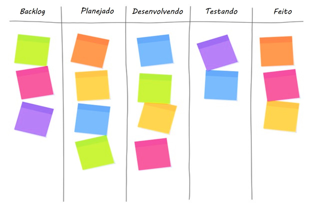 Originalmente construído usando um quadro em branco, ele é dividido em colunas. Cada coluna representa uma etapa do fluxo de trabalho, por exemplo, “em Backlog”, “Planejado”, “Desenvolvendo”, “Testando”, “Feito”.