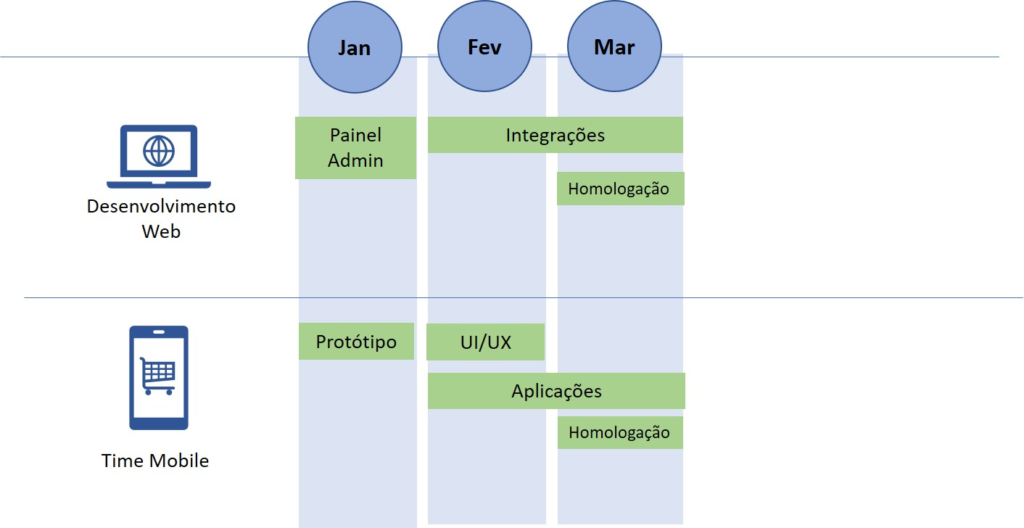 Por exemplo, no modelo abaixo mostra roteiro estratégico que divide o projeto em times e suas tarefas individuais.