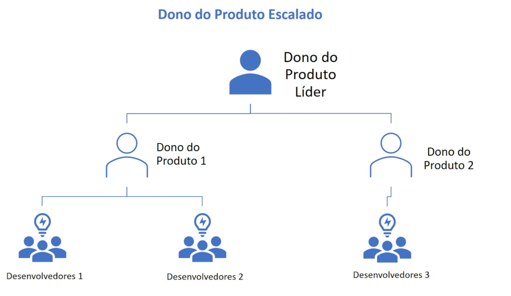 Em um projeto muito grande normalmente aparece a figura escalada do(a) Dono(a) do Produto (PO), chamado de Dono(a) do Produto (PO) Líder, conforme mostrado na figura abaixo: