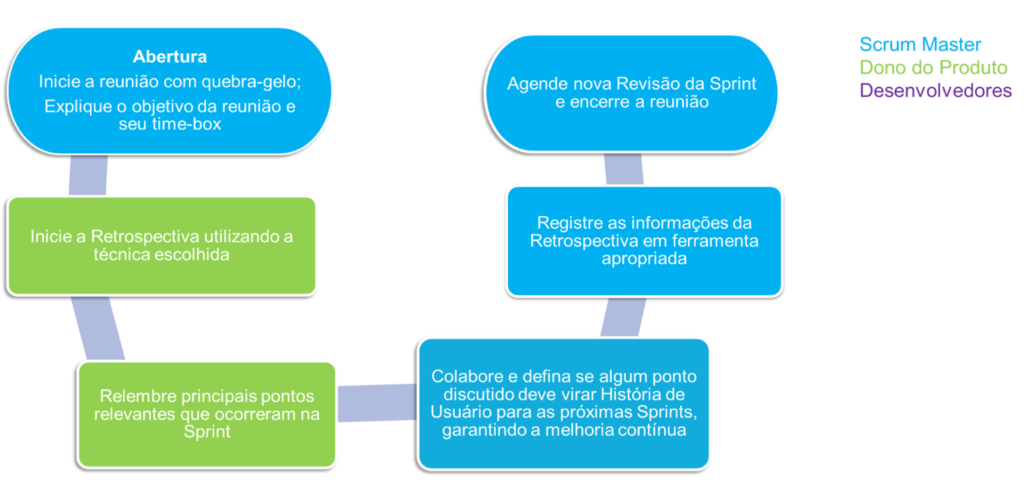 - Em seguida explique o objetivo da Reunião de Retrospectiva da Sprint, suas regras e timebox. É importante deixar alinhado o entendimento sobre o evento e suas regras. Usualmente é compartilhada uma apresentação com o Time Scrum