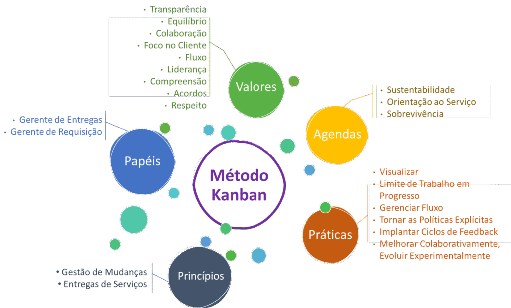 O Método Kanban possui 2 papeis sugeridos, 9 valores originais, 3 agendas, 2 princípios, 6 práticas, 7 cadências e 4 métricas. São eles: